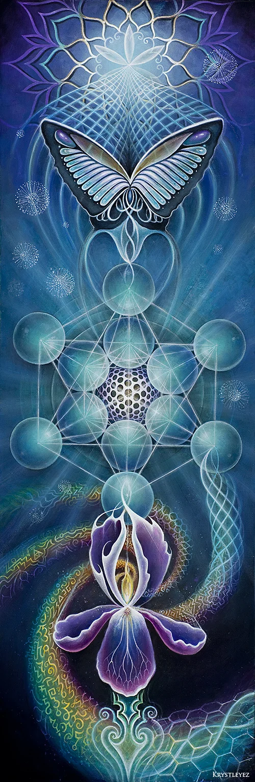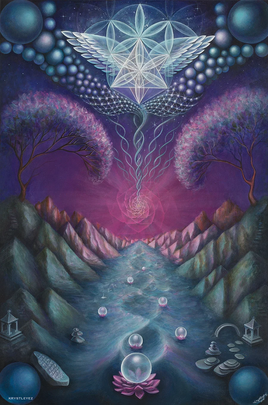 Krystle embraces the power of art as a vehicle for personal and collective transformation. In a world stifled by the illusion of separation, she shares impacting visions of unity. Exploring the luminous landscapes of consciousness, her multidimensional paintings radiate transcendental light with balanced serenity. Pulsing and breathing with life, the etheric geometries which dance off her canvas disintegrate the boundaries between art and audience. Her artwork navigates the way between heart, mind, and the enchanting realms of spirit as cosmic maps into the interconnected nature of existence.